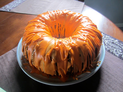 -Using a spoon or spatula, drizzle the frosting around the cake. Warning: it will get everywhere so have your cake on a plate to catch the frosting!